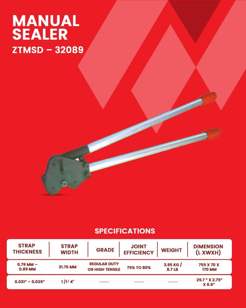 The ZTMSD-32089 Manual Steel Strap Sealer delivers strong double-notch sealing for heavy-duty strapping, ensuring secure joints and reliable performance in industrial applications.