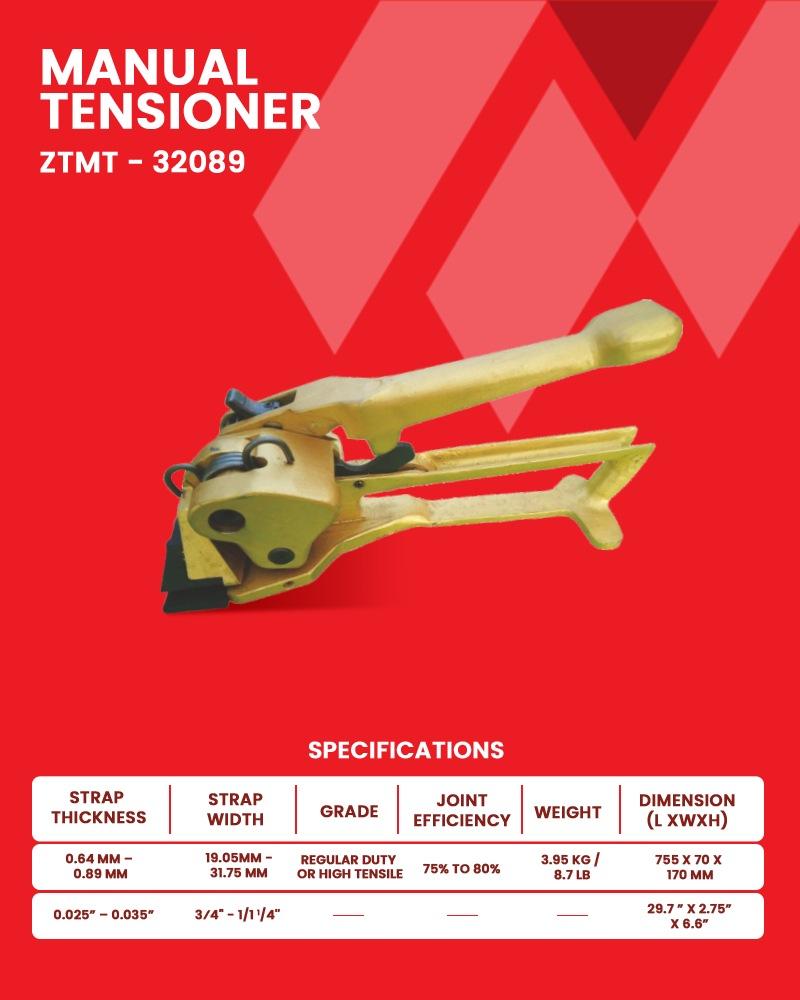 The ZTMT-32089 is a medium-duty pusher-type manual strap tensioner designed for flat, round, and irregular-shaped packages. Built with a forged alloy steel base frame, it offers durability, ease of use, and reliable performance for industrial and commercial applications.