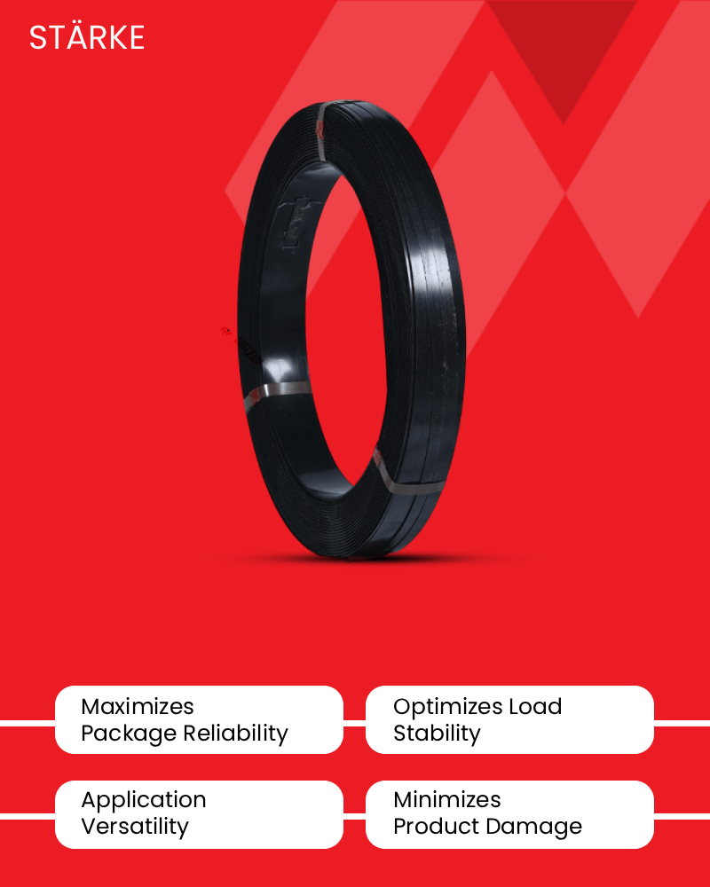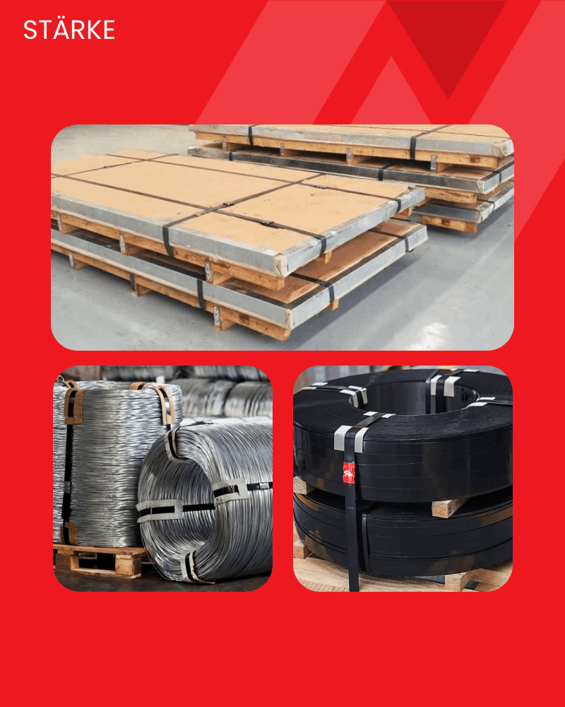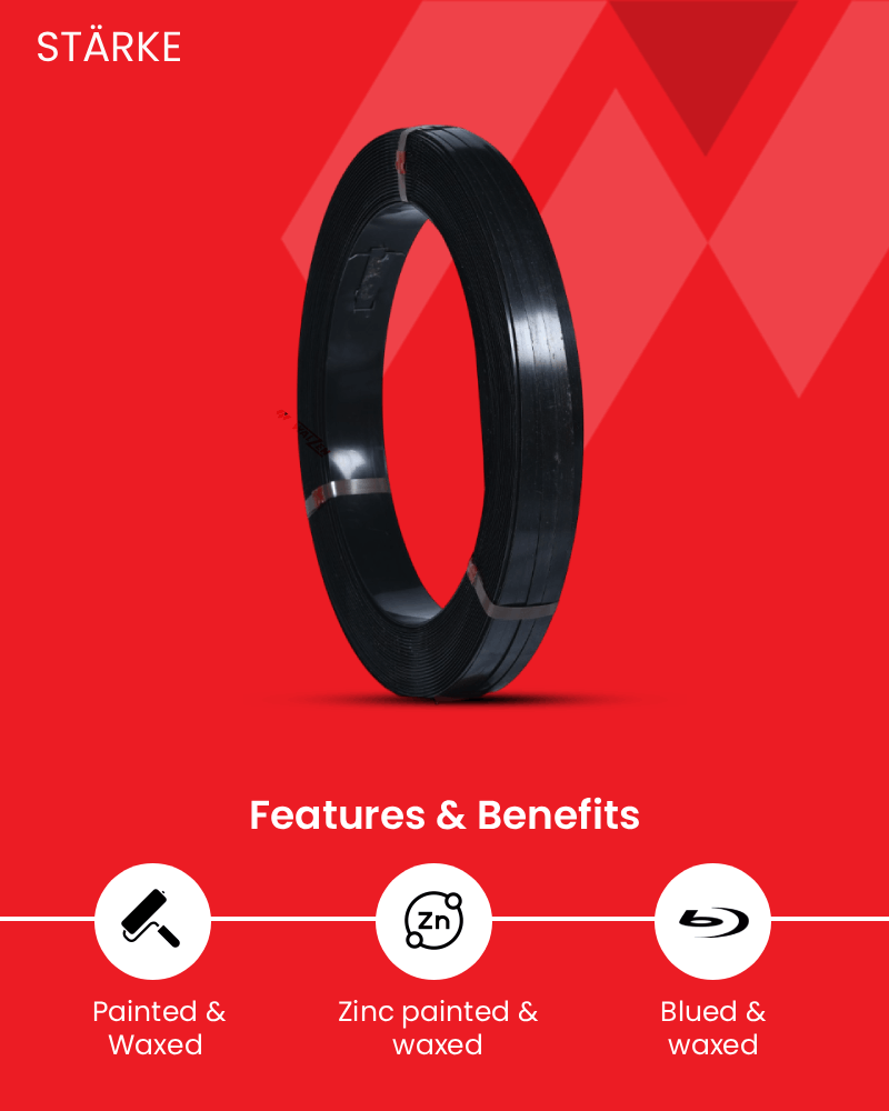 Walzen STÄRKE is a cold-rolled. heat-treated, steel strapping that provides high tensile strength and better shock resistance for the heavy applications. STÄRKE quality steel strapping is having extra load capacity compare to regular grade steel strapping. At the same time this grade will give better percentage of elongation compare to other regular grade steel strapping. The product can be a suitable for heavy packaging in the steel plants.