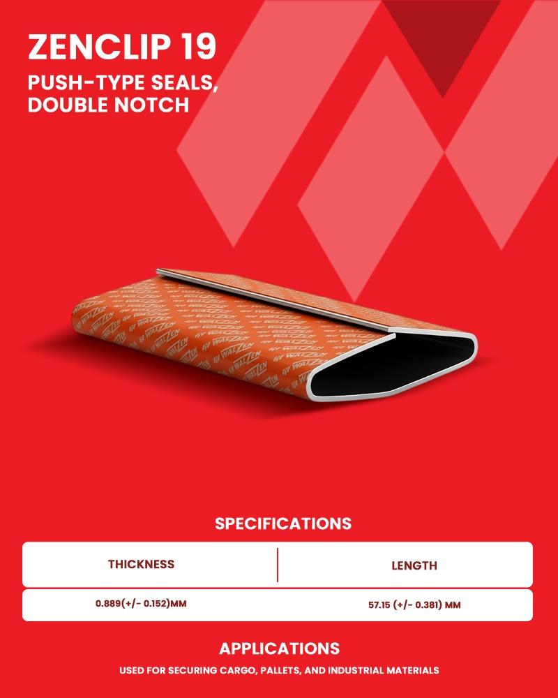 ZENCLIP 19 Push-Type Steel Strapping Seals offer strong, reliable closure for steel strapping, featuring full-hard steel construction, double-notch locking, and crowned design for smooth tool operation.